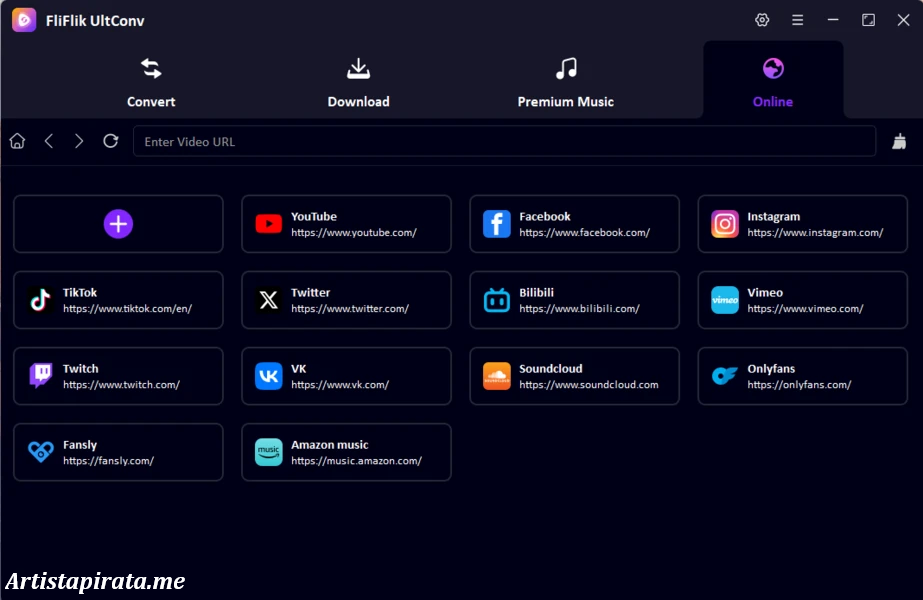 FliFlik UltConv también funciona como descargador, permitiendo obtener vídeos y audio de más de 10 000 sitios web, incluyendo plataformas tan conocidas como YouTube y Facebook. Esta funcionalidad facilita a los usuarios la tarea de almacenar contenido directamente desde internet.