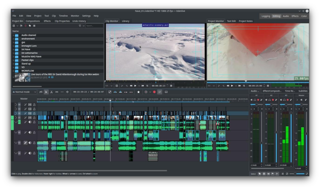 - Kdenlive proporciona herramientas para analizar imágenes y sonido, ayudando a los usuarios a garantizar los niveles adecuados y la uniformidad visual para quienes buscan avanzar en sus proyectos.